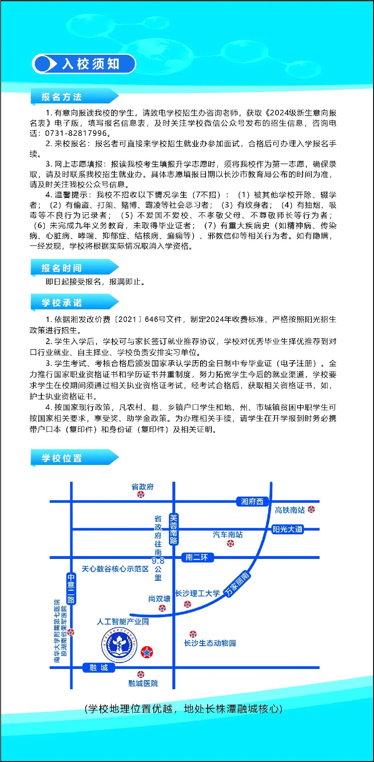 学校也是经天心区委、区人民政府和天心经开区重点招商引资,全面贯彻《长株潭区域一体化发展规划纲要》和省、市关于打造长株潭科技创新高地的决策部署,围绕康养医卫产业、人工智能和软件大数据信息技术,重点扶持打造的一所具有医卫类和信息技术类特色的中职学校。