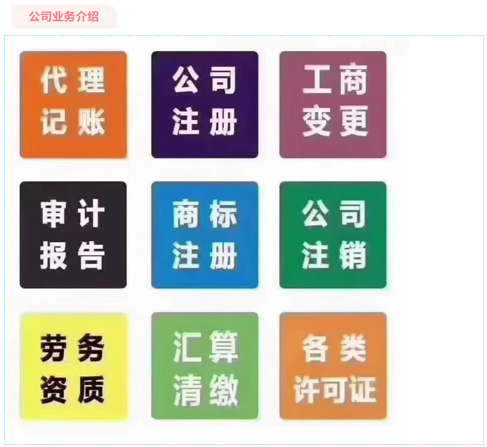 主营业务:营业执照(公司、个体户、合作社)注册业务、变更、注销、工商年检、代理记账、税务申报、商标注册、审计、社保开户、银行开户、政采云平台等业务