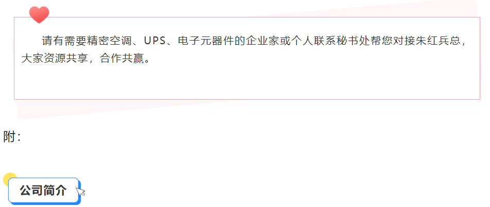 姓名:朱红兵 籍贯:湖南桂阳和平镇 所属商会:深圳市桂阳商会 商会职务:会员 联系方式:13823734087 教育背景:大专 工作经历:30年计算机房设备服务 兴趣爱好:篮球 加入商会的原因:向优秀的老乡学习 期望合作:相关业务项目合作 【企业介绍】 企业名称:深圳市亨运电子有限公司 经营地址:深圳市龙华区龙华大道南贤商业广场A座1706 主营业务:精密空调、UPS、电子元器件销售 行业分类:计算机房设备&电子元器件 公司职务:总经理